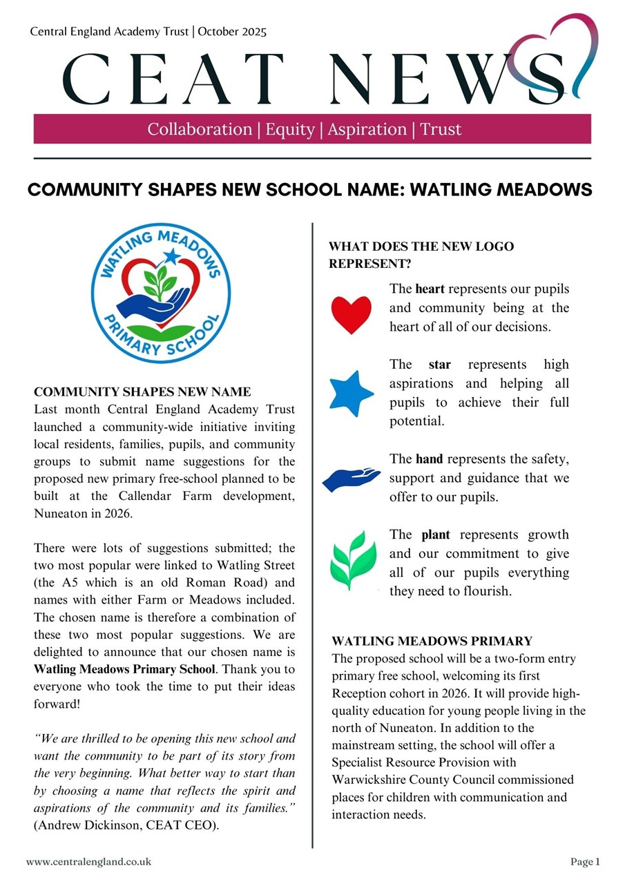 Last month CEAT launched a community-wide initiative inviting local residents, families, pupils and community groups to submit name suggestions for the proposed new primary free school planned to be built at the Callendar Farm development in Nuneaton!